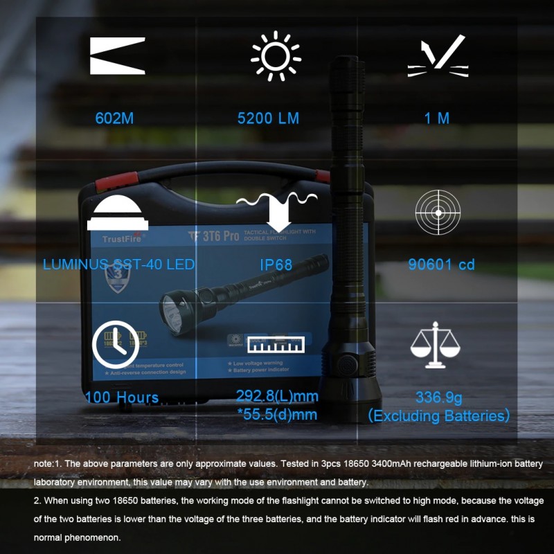 Trustfire 3T6 Pro es una linterna táctica de largo alcance de 602m con doble interruptor. 3T6 Pro tiene una fiabilidad extremadamente alta y más operatividad, cuatro niveles de brillo y estroboscópico, alimentado por 2 o 3 piezas de baterías de iones de litio recargables 18650. Adoptando un reflector de gran calibre bien diseñado. Los modos de cambio rápido de un botón se cambian en el cuello. IP68 impermeable y anticaída de hasta 1 metro de altura, le permite usarlo de forma segura en entornos al aire libre.